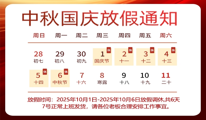 国庆中秋休假通知:本司定于2025年10月1日-10月6日休假共计6天,7日正常上班发货,30号订单7号发出,请各位老板合理安排工作事宜。